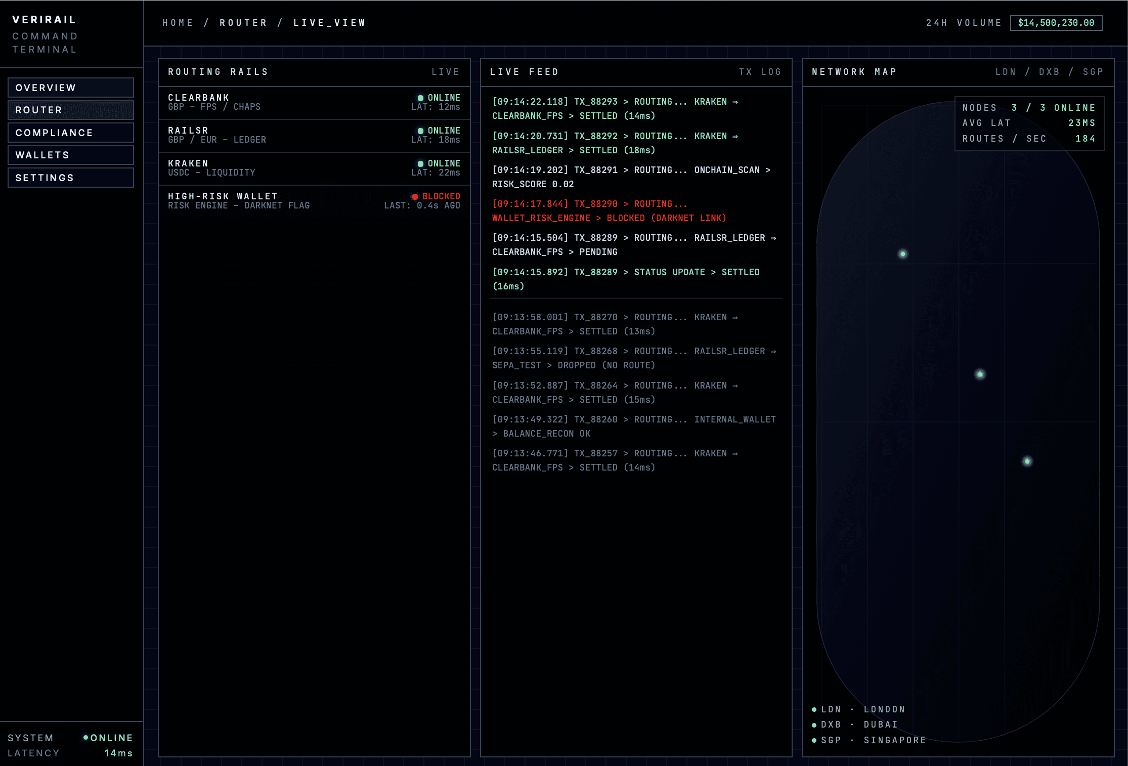 Stop integrating banks one by one. Connect VeriRail once. We route your volume to the most efficient partner (ClearBank, Railsr, OpenPayd) automatically.